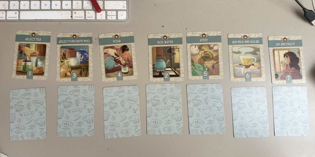 To set up, you shuffle the tea-making step cards and lay them out in a row. Beneath them, you place a row of worry cards face down. The goal? Brew the perfect cup by scoring 12 or more points by the time all the worry cards have been revealed. If everything is in the correct order and you’ve managed to dispel your worries, congratulations—you’ve made the perfect cuppa!
