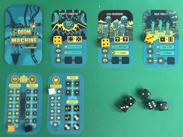 There is minimum set up to the game – take it out the tin, and place the two cards that track your health, and the machine’s sentience. Find the machine’s core then shuffle the rest of the cards (these represent the different parts of the machine. Remove 6 cards and put them back in the tin, then add the core to bottom of the stack of the remaining cards. Turn over three adding dice to represent their HPs, and you’re ready to go. A turn consists of you rolling your dice and try to utilise them to both damage the machine and protect yourself from it. You begin with only 5 dice so choices at the start are limited and as a result a little angst-ridden. Aside from assigning dice as damage by matching a die to the required symbols on a card, you can also use them to act as shields or activate things such a reroll or adjust the die number. Your dice pool grows if and when you beat parts of the machine. Once you have taken your turn the machine makes its move usually doing you damage or making itself stronger. To represent its actions the dice on each card moves along a track. This lets you try and plan for what the machine will do each turn, thus hopefully allowing you mitigate damage etc. The good news if you survive the machines turn, you start a new round, the bad news is that each round a new part of the machine is added thereby giving you another thing you have to deal with. And so the game continues, if you survive until the last card is turned over then you reveal the machines core, defeat that and you win.