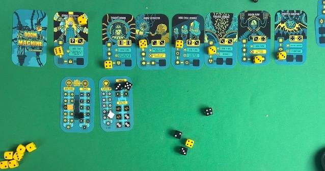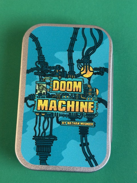 This week’s lunch is Doom Machine by Nathan Meunier. It’s a solo dice game which was on Kickstarter a few years ago, but can still be bought as a print and play. This version of the game fits neatly into a mint tin, making it highly portable. The premise of the game is that you need to defeat an ever-evolving machine that wishes to wreck death and destruction on humanity. It’s incredibly tough to win, I’ve never beaten it but then again maybe that’s just me playing badly!