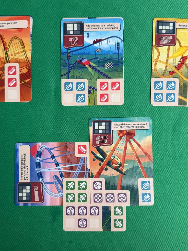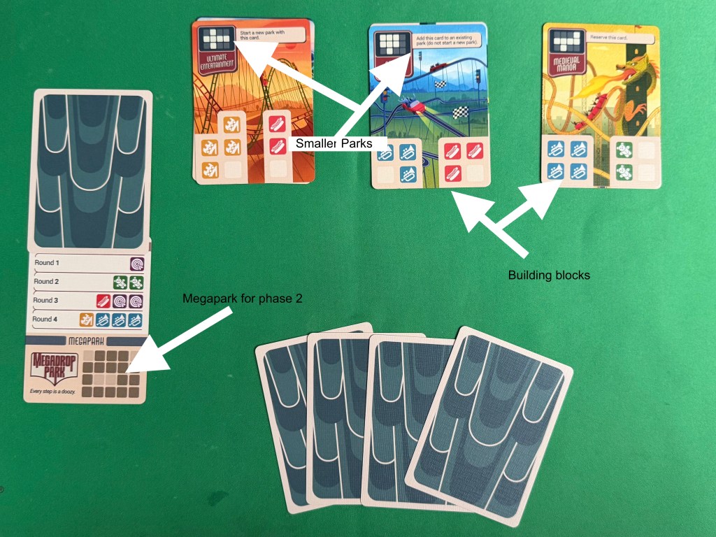 You then move all the cards to the discard pile, which reveals the next park in the stack. When you have no more cards in your hand, the round ends, now you must ‘reserve’ one card for the megapark – in the card below round 1 would require you to reserve a card with a purple icon, round 2 green and so on. Phase one of the game continues until all the rounds on the megapark are covered then it’s time for phase 2.